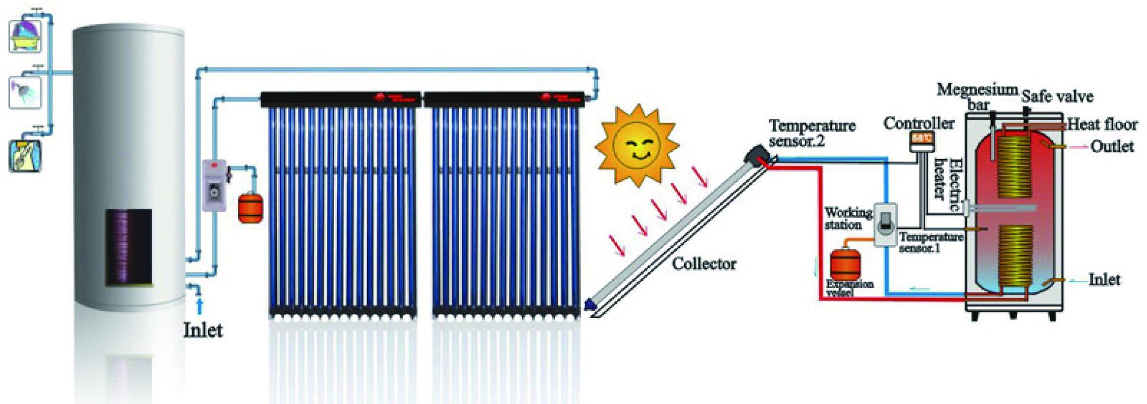 4.Back up with electric heater so that in the day without sunshine hot water can also be used.